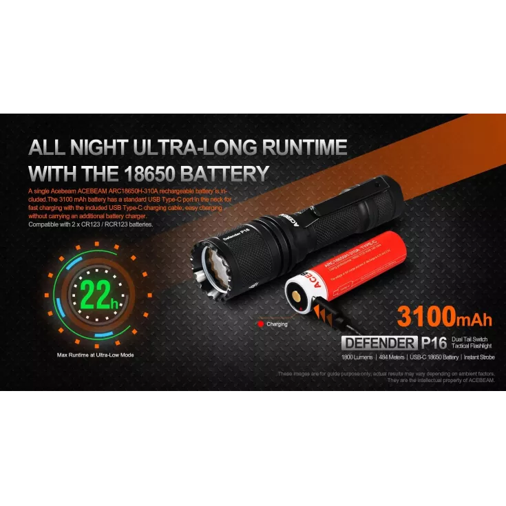 The Acebeam Defender P16 flashlight has a maximum output of 1800 lumens from the Luminus SFT40 LED and is powered by 1 x 18650 li-ion or 2 x CR123/RCR123 batteries. The torch includes an Acebeam 3100mAh 18650 battery with a built-in USB-C port for simple recharging with the included USB charging cable.