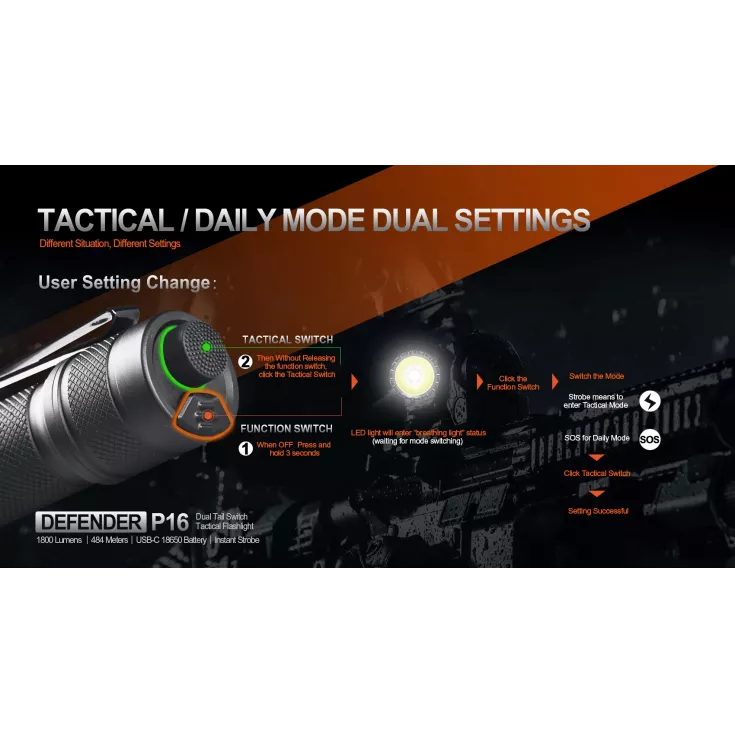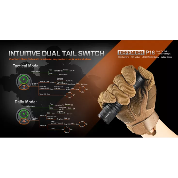 The flashlight features two operating modes with four brightness levels and two special modes. The Defender is operated by a dual tail interface, made up of a tactical switch which turns the light on and off, and a functional switch for changing the brightness level.