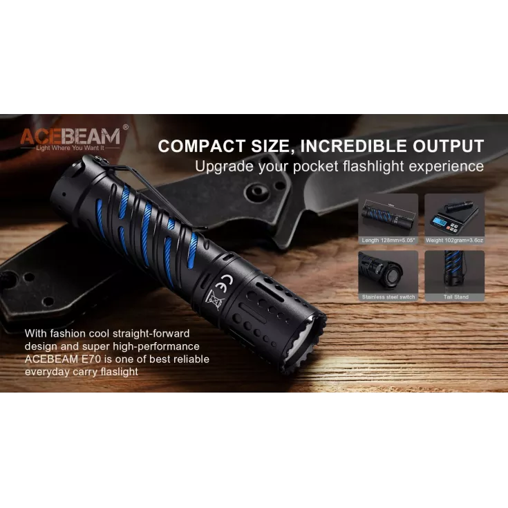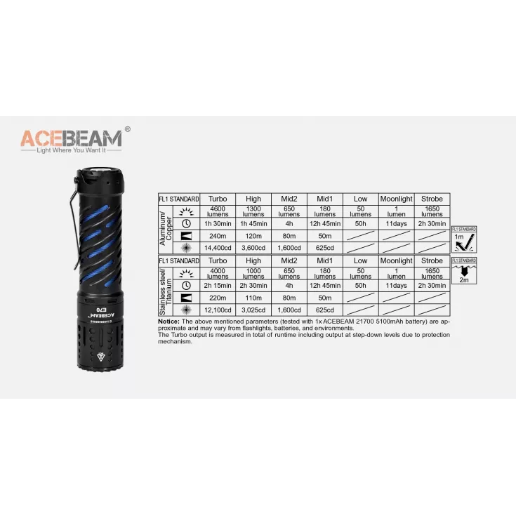 The Acebeam E70 flashlight has a maximum output of 4600 lumens from the XHP70.2 6500K cool white LED and is powered by 1 x 21700 li-ion battery. The included Acebeam battery has a 5100mAh capacity and a built-in USB-C charging port for direct charging into the cell.