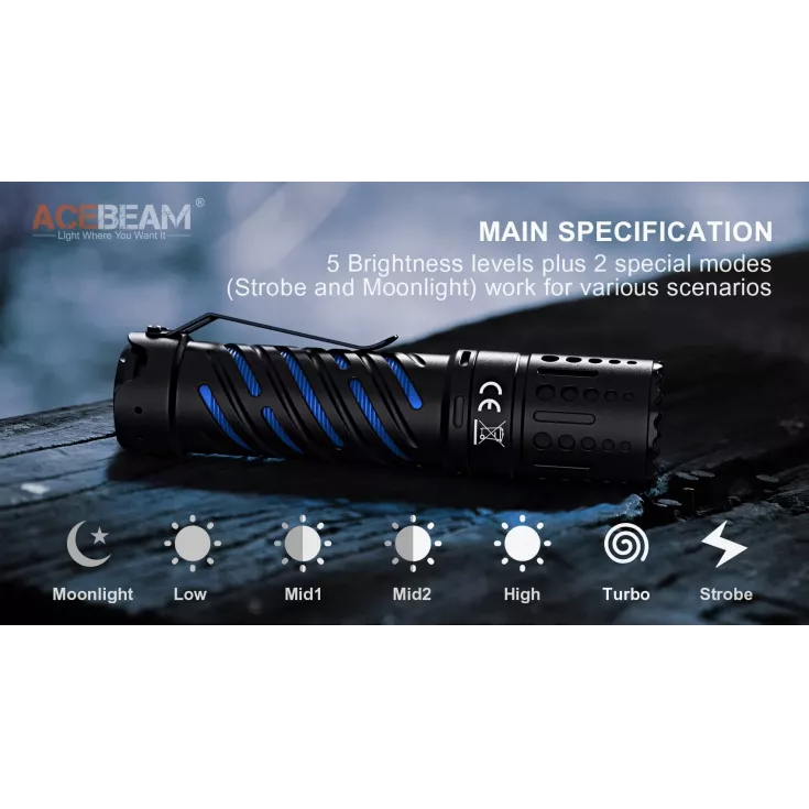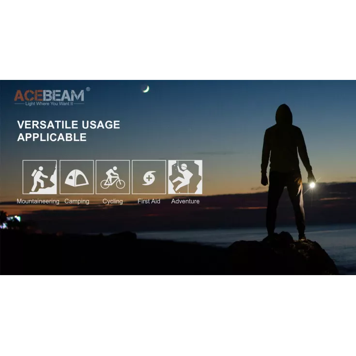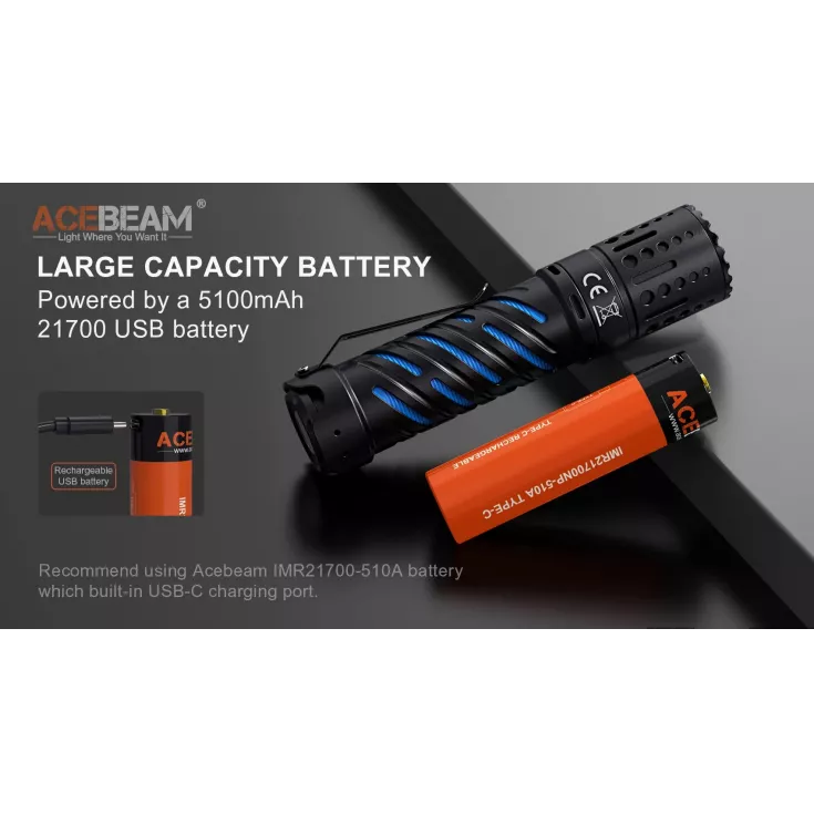 Includes: Acebeam 5100mAh 21700 li-ion battery with USB-C port, charging cable, drawstring pouch, lanyard, spare o-rings.