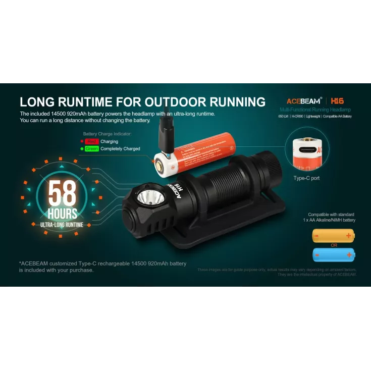 Includes: Acebeam 14500 920mAh li-ion battery with USB-C port, type-C USB charging cable, headband with silicone holder, pocket clip, 2 x spare o-rings.