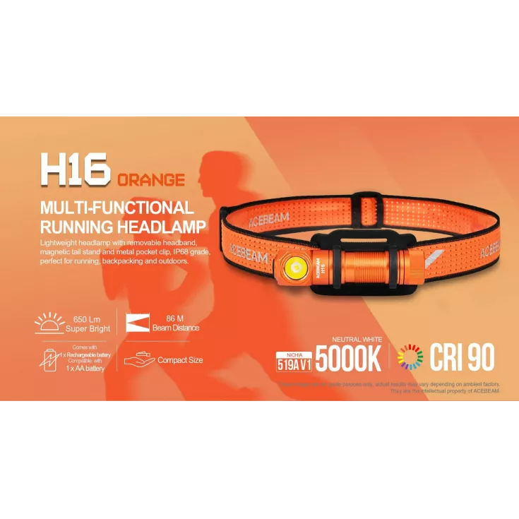 The H16 offers five brightness levels and an SOS mode, all of which are operated by the single switch on the top of the light. The flashlight has a 100° wide range flood beam and a choice of 5000K neutral (black or orange headlamp) or 6500K cool white (grey headlamp) beam temperature.