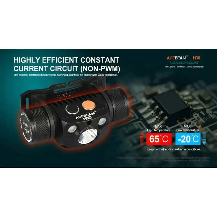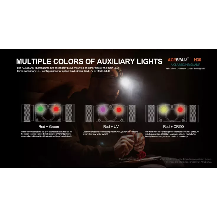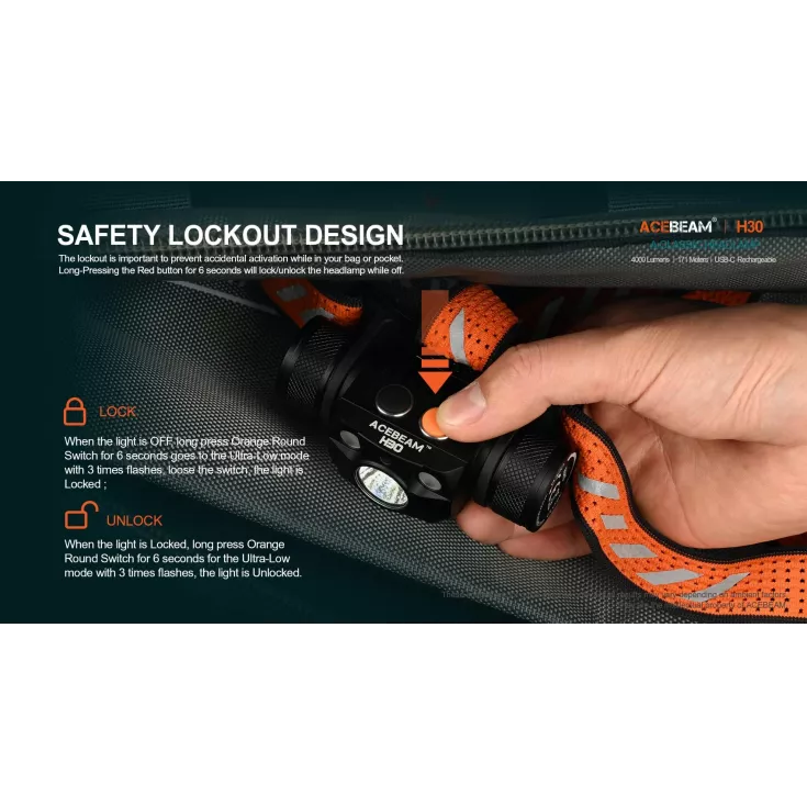 The head torch features 6 brightness levels ranging from 3 to 4000 lumens, plus an SOS mode for emergency use. Additionally, the H30 has auxiliary red and green lights which can be used to protect night vision and reduce eye strain. All outputs are operated by the dual switches on top of the lamp, for fast and easy access to the desired mode. Lockout mode is available to prevent accidental activation.