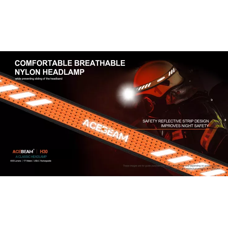 The angle of the H30 can be adjusted up to 180° to change the area that is illuminated. The orange headband is made from breathable nylon and has reflective detailing to improve visibility.