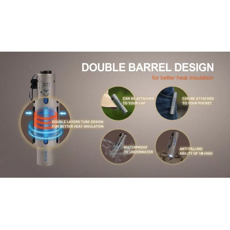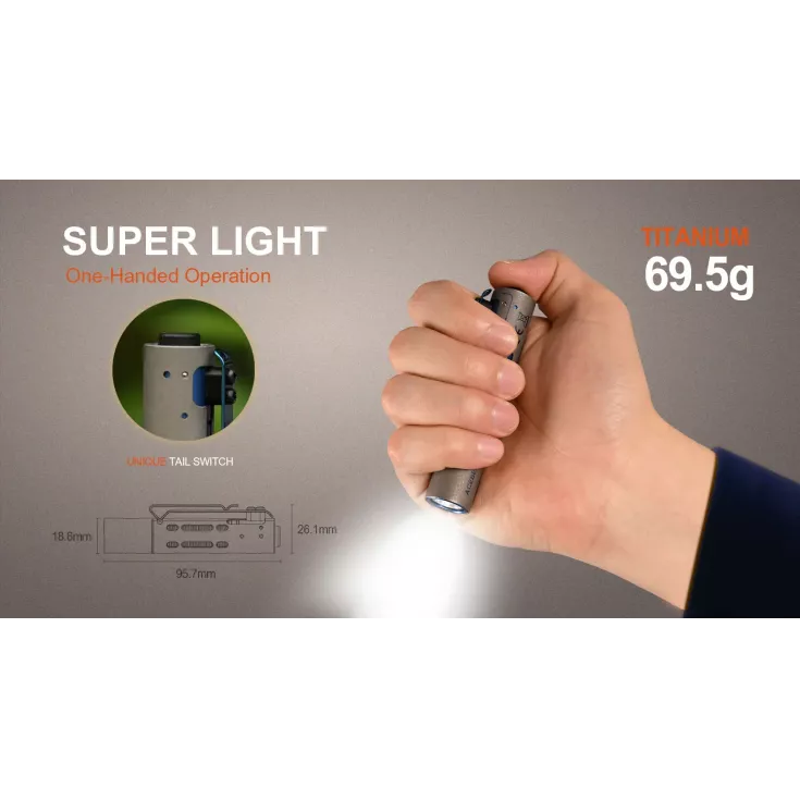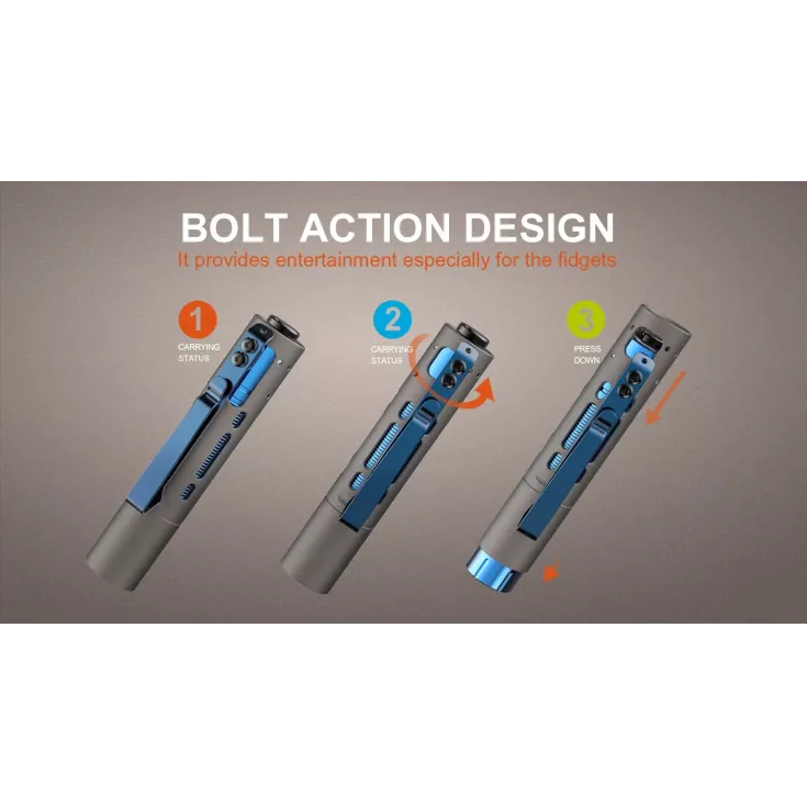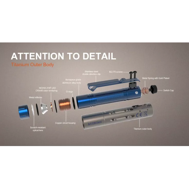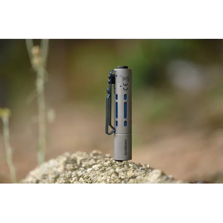 The Acebeam Rider RX Ti features an outer and inner body with a bolt action design pocket clip that clicks back and forth. The pocket clip is bi-directional allowing the torch to be carried with the LED facing up or down.