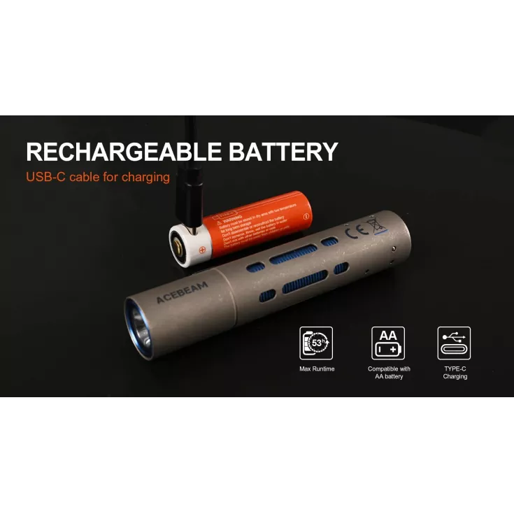 Acebeam Rider RX Titanium Includes: 14500 Li-ion rechargeable battery and pocket clip.
