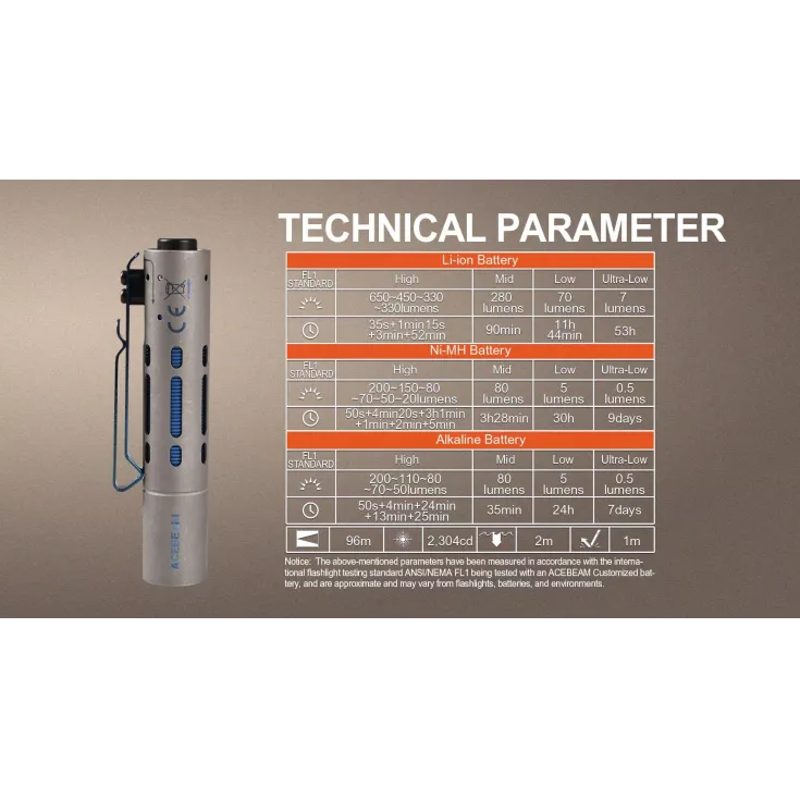 Maximum output (using supplied 14500) is 650 lumens from the Nichia 219F LED with a high CRI 5000K, which displays true to life colours and wide even beam pattern with a range of up to 96 meters. On high level the brightness level will lower to prevent overheating as below: