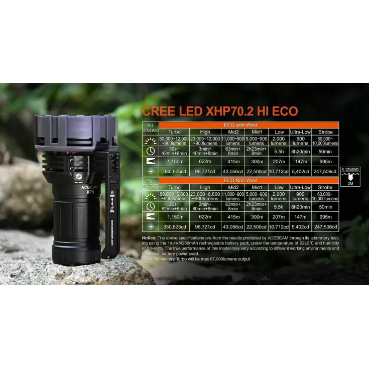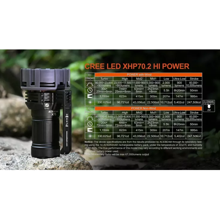 Turbo: 80,000 / 6,800 / 900 lumens – 20 secs / 70 mins / 8 mins runtime