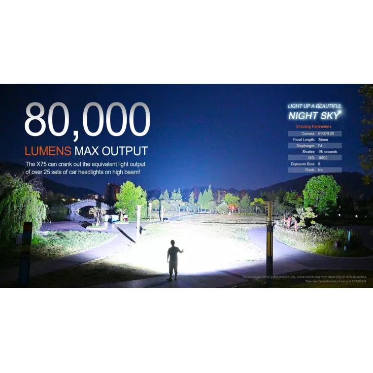 Turbo: 80,000 / 23,000 / 900 lumens – 30 secs / 20 mins / 8 mins runtime