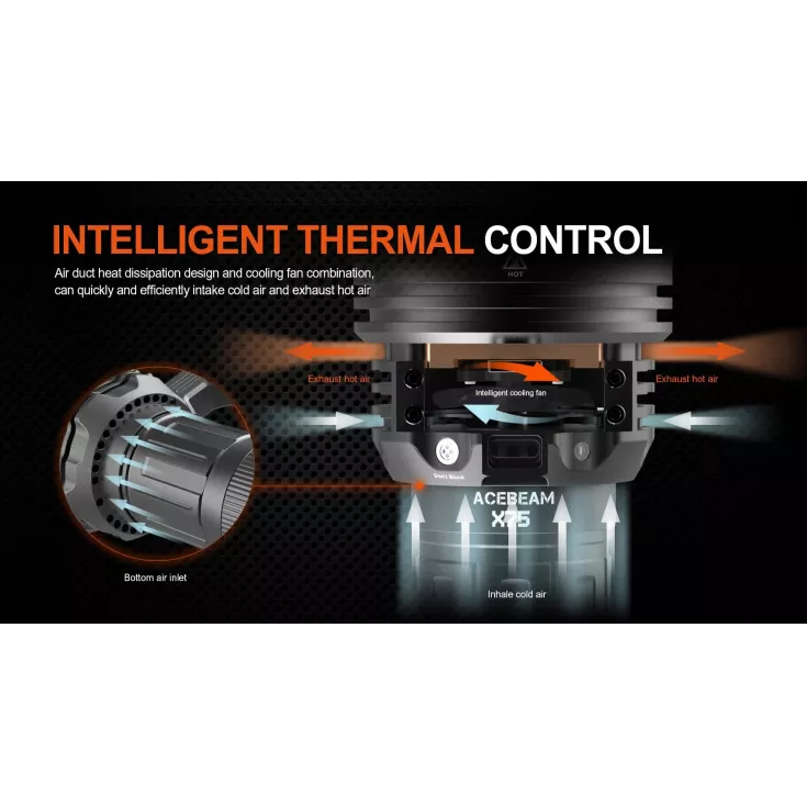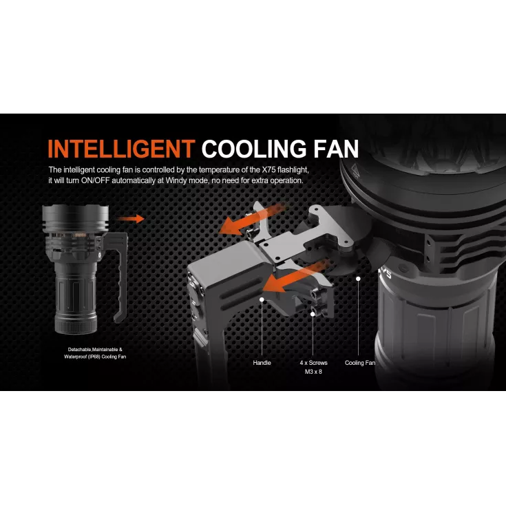 In addition to being a high power, high performance searchlight, the X75 can be used as a power bank, supporting PD60W~100W input and output. The flashlight has a hidden USB-C port at the tail end with charging indicators that change from red and blue whilst charging, to green and blue when fully charged.