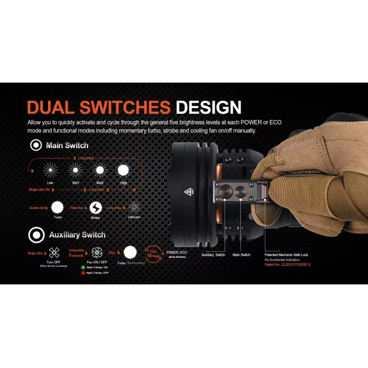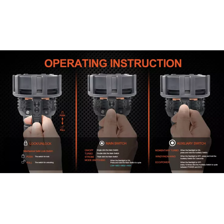 The Acebeam torch is operated by a dual side switch interface. The main switch turns the light on and off, accesses Strobe mode and cycles through the brightness levels. The auxiliary switch provides momentary turbo and can change from windy to non-wind and eco to power modes. Beneath the side switches is a lock switch which can put the light in and out of lockout mode, preventing accidental activation.