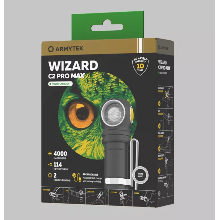Suitable for a range of applications, the light can be used as a headlamp with the included headband for hands-free illumination or as a bike light with the ABM-01 mount (sold separately). Alternatively, the Wizard C2 Pro Max works as a forward-facing hand-held flashlight or attach to your gear with the included pocket clip. The light can also be attached to a metal surface with the magnetic tail end.