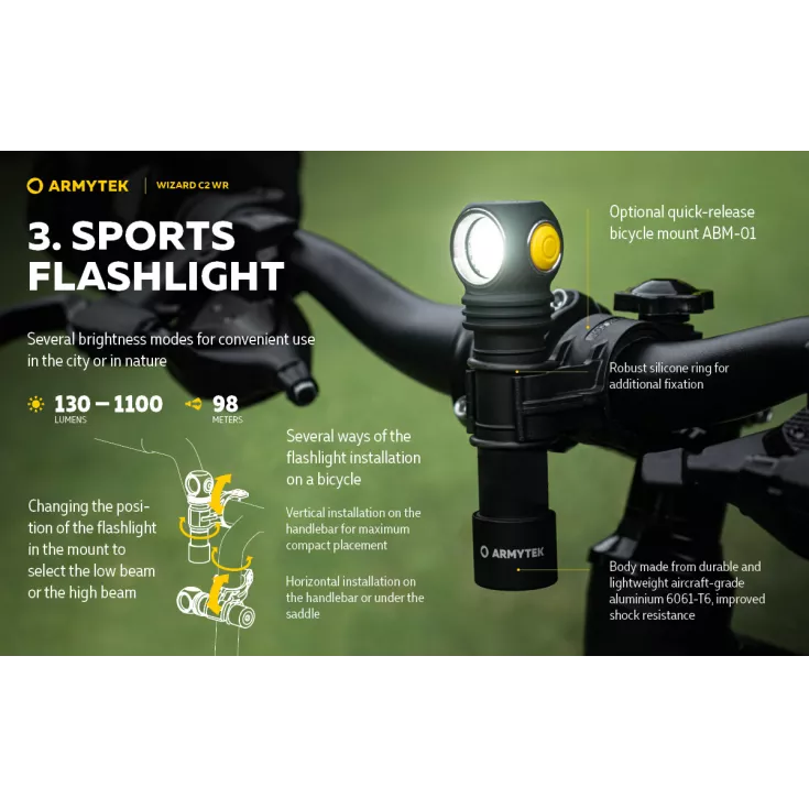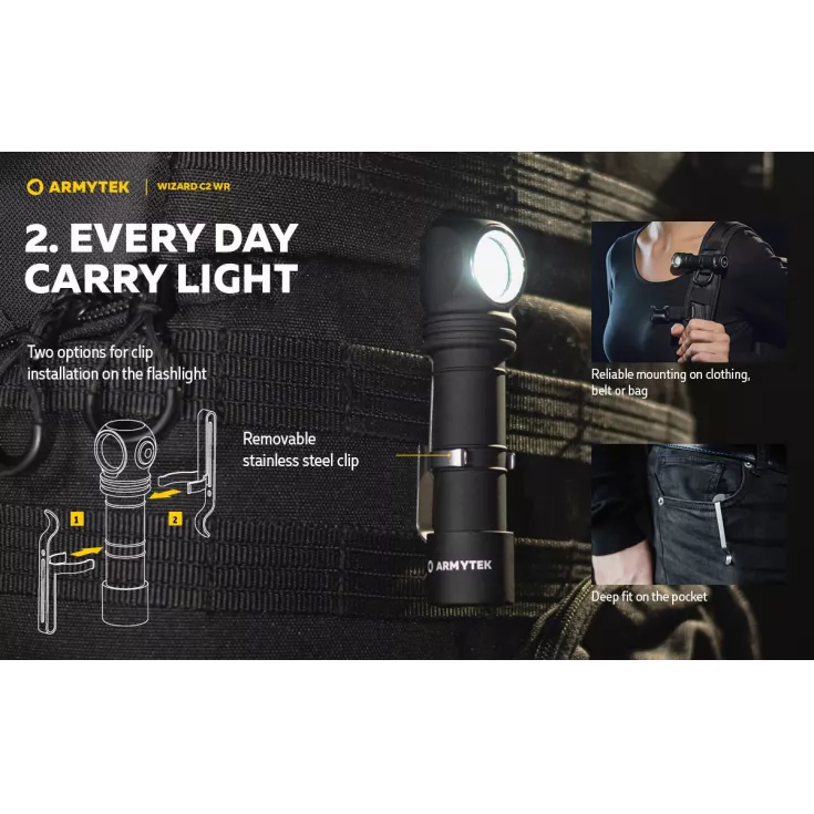 The Wizard C2 WR can be used as a head torch with the included headband. Alternatively, the flashlight can be removed from the mount and used with the pocket clip, attached to a metal surface using the strong magnetic base or used with a bike or helmet mount (sold separately).