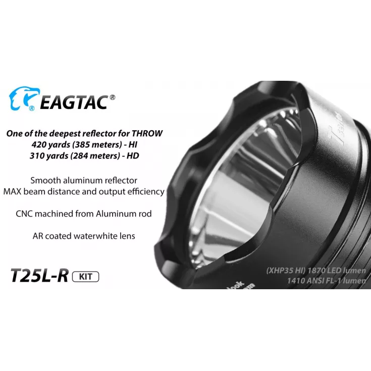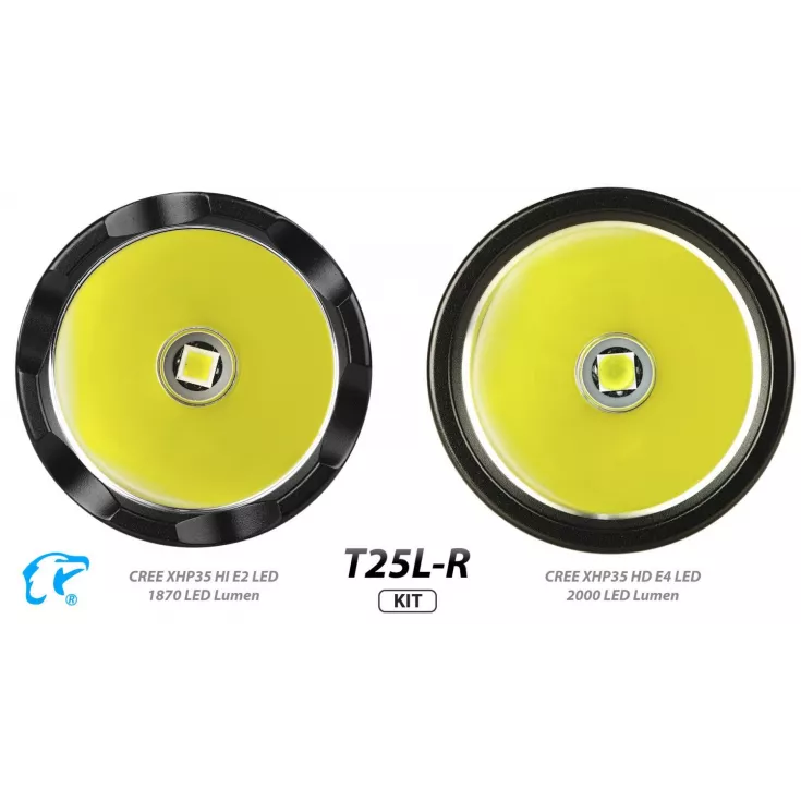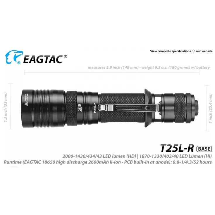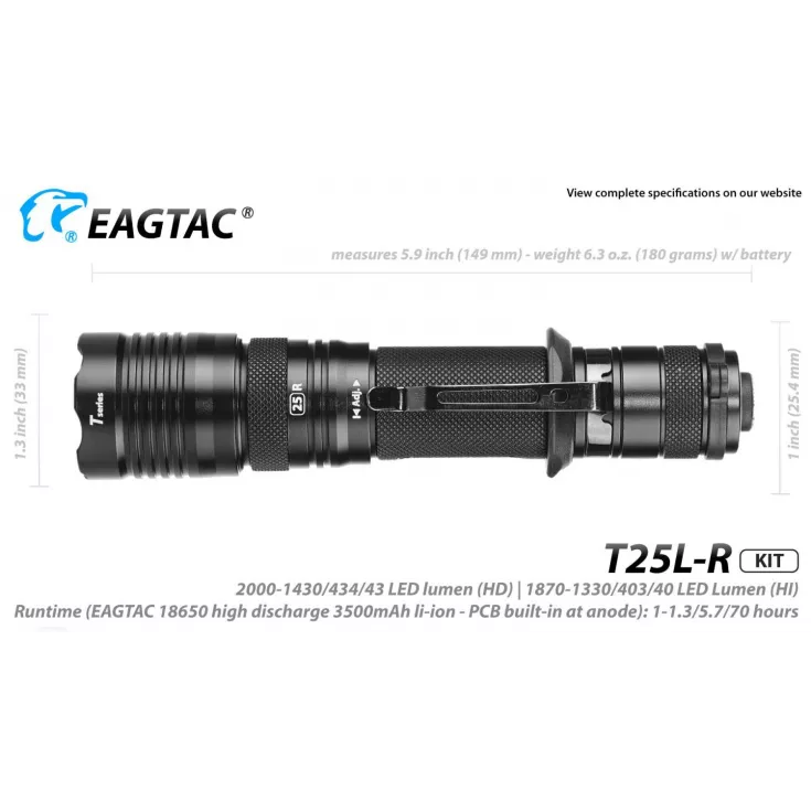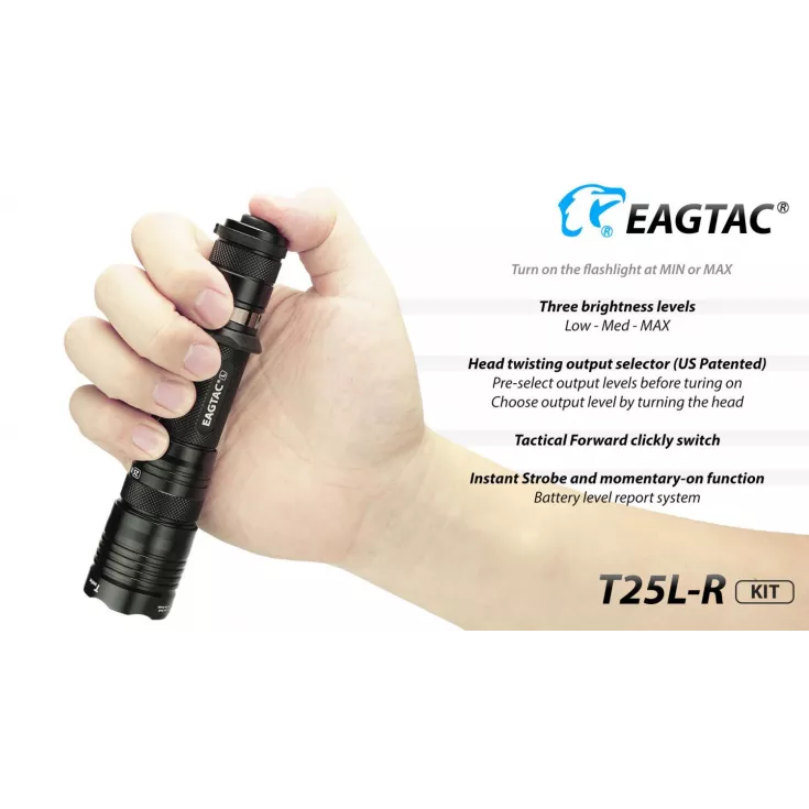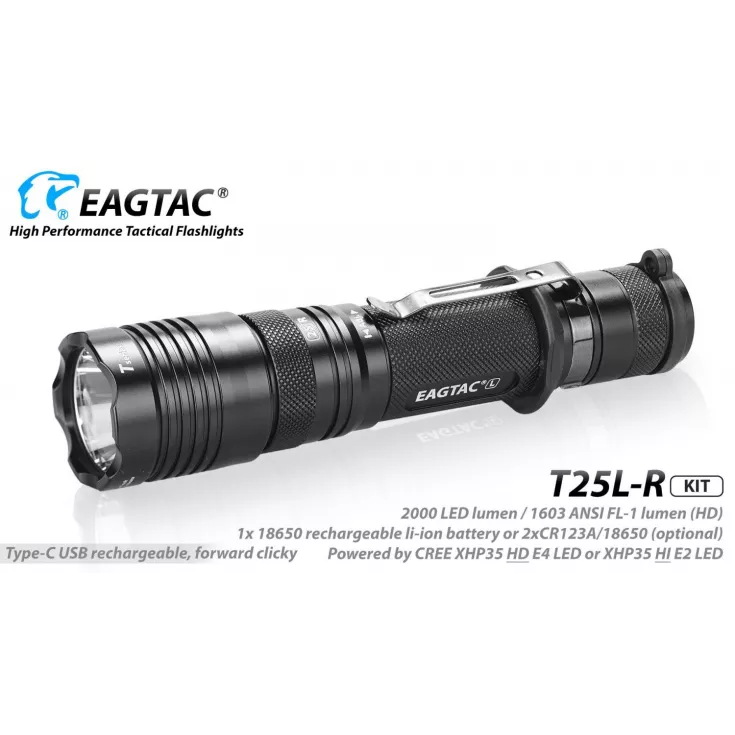 The Eagletac T25L-R torch has a maximum output of 1603 lumens from the Cree XHP35 HD E4 LED and can be powered using 1 x 18650 (included) Li-ion battery or 2 x single use CR123 cells.
