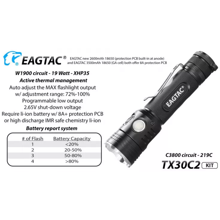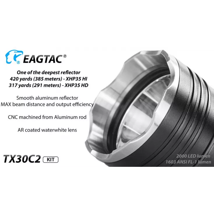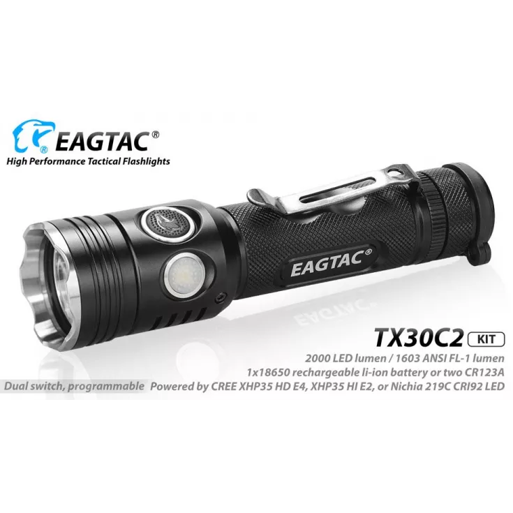 The Eagletac TX30C2 torch has a maximum output of 1603 lumens from the Cree XHP35 HD E4 LED or approximately 7% less from the Cree Nichia 219C LED. The flashlight is powered by either 1 x 18650 Li-ion batteries or 2 x CR123 single use cells. Please note, the Kit version comes with a body tube and can take 2 x 18650 batteries, however it cannot take 4 x CR123 single use cells.