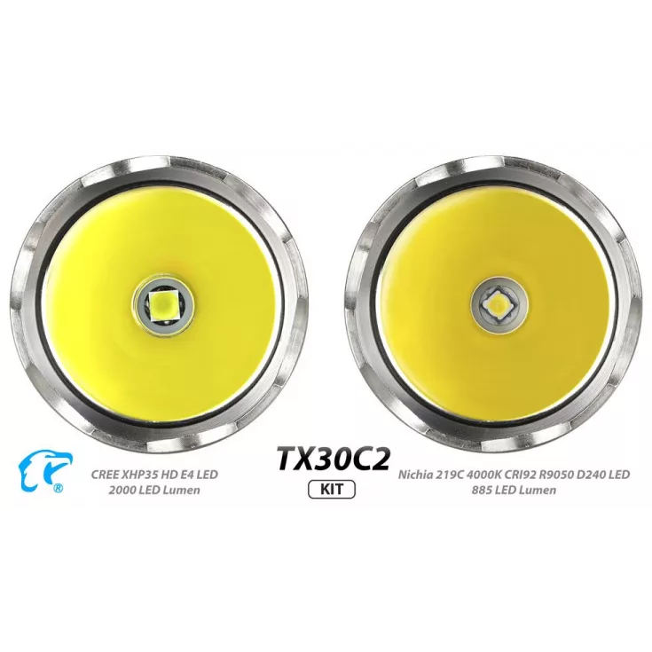 The TX30C2 is available with a either an XHP35 HD E4 LED in Base or Kit version. The base version has a smooth aluminium black bezel, where as the kit version features a crenulated, stainless steel bezel. Both models comes with spare o-rings and a lanyard. The kit version comes with an add-on diffuser and a nylon holster.