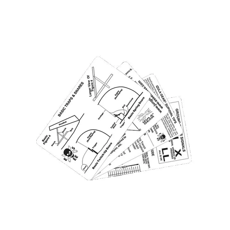 The white cards are made from 30 mil plastic and include signalling tips, trap and snare diagrams, fire building tips, navigation tips, escape and evasion tips and information on Morse code.
