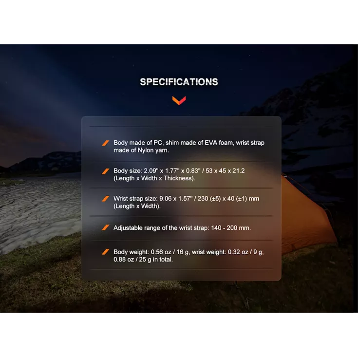 The flashlight holder can be worn on the side or top of the wrist and is compatible with the following Fenix torches: E12 V2, E16, E18R V2, LD12, LD22 V2, E35 V3, PD25R V2, PD32, PD35 and PD36 series LED torches.