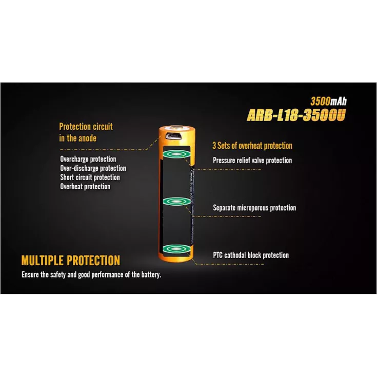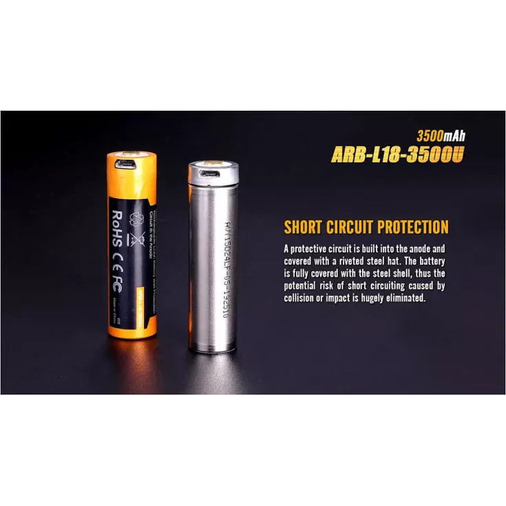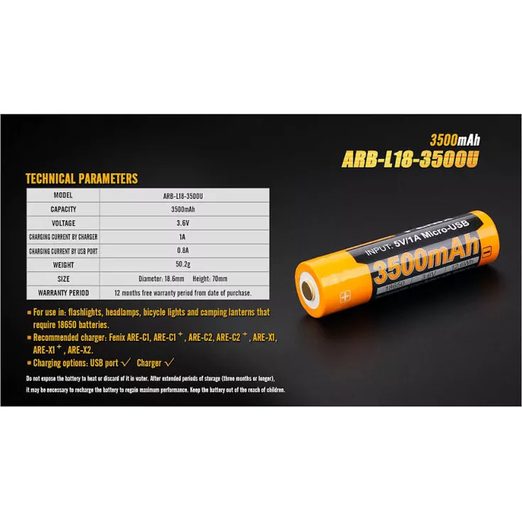 The Fenix ARB-L18 3500U battery is a high quality Li-ion battery that is perfect for any 18650 powered torch. The battery has a built-in micro-USB port removing the need for an external charger (although can be charged in a mains charger if preferred.)