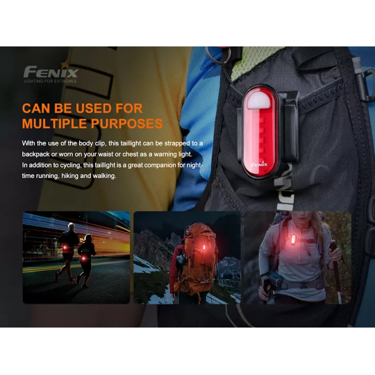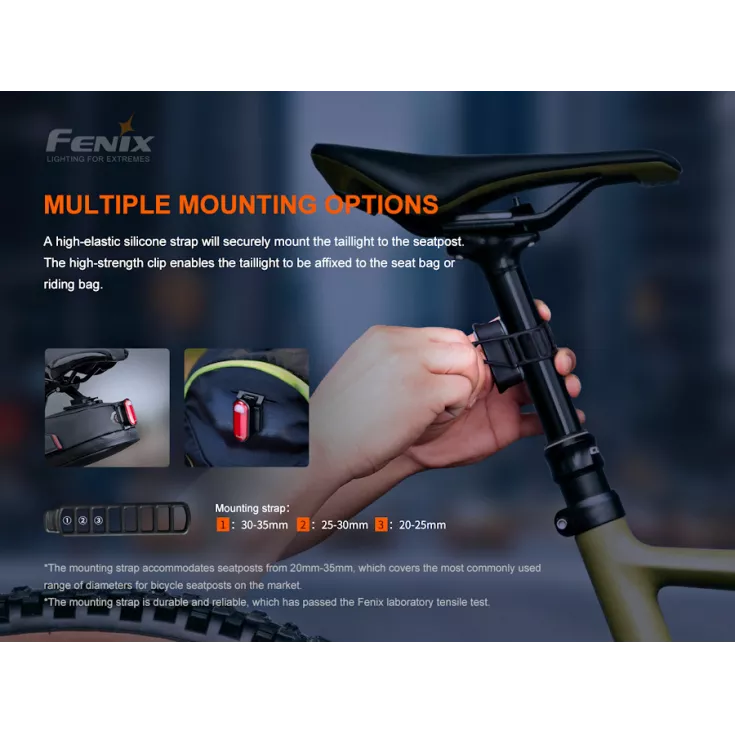 The light comes with a mount that securely attaches the BC05R V2 to a seat post with a diameter from 20 to 35 mm and a high strength clip for attachment to a seat bag, other accessories or clothing. These dual mounting options allows the light to be used for other applications, such as running, hiking and walking.
