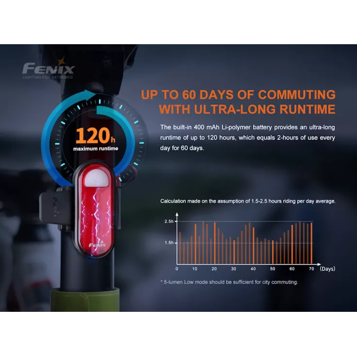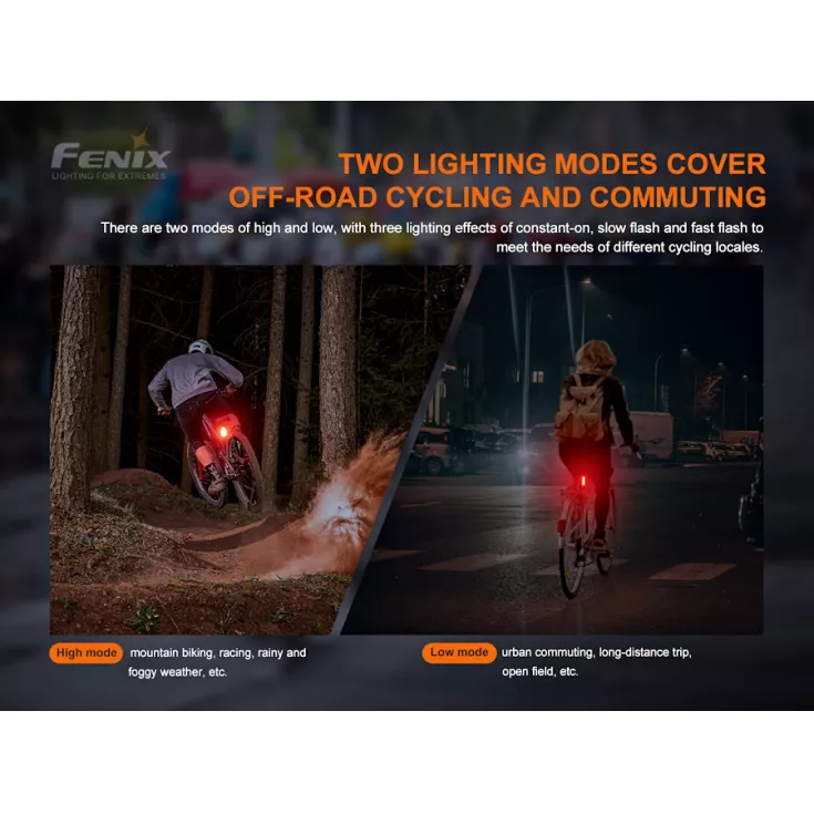 The Fenix BC05R V2.0 offers two modes with three brightness levels in each. Choose from High mode (ideal for mountain biking, racing, rainy or foggy weather) and Low mode (urban commuting, long-distance trip, fair weather) with each mode featuring three brightness levels – constant, slow flash and fast flash.