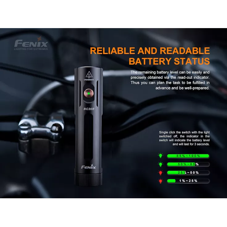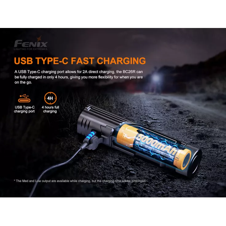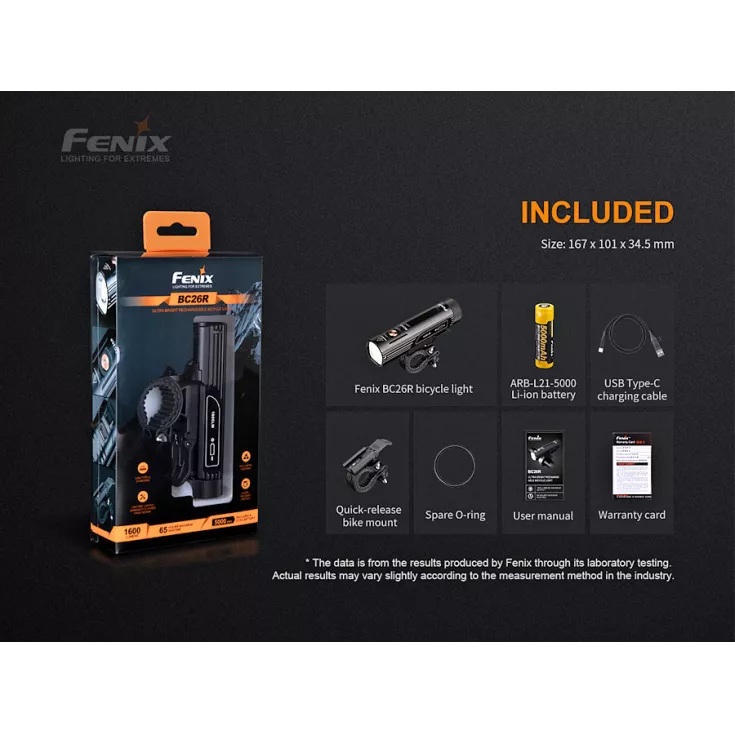 The Fenix BC26R includes: Fenix ARB-L21-5000 5000mAh li-ion 21700 battery, USB Type-C charging cable, quick release bike mount, spare o-ring.