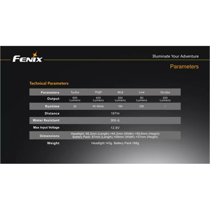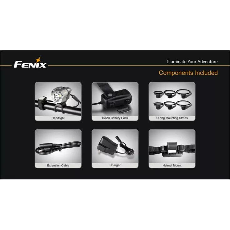 Includes: Fenix BA2B battery pack, o-ring mounting straps (2 for handlebars 20-24mm, 2 for handlebars 24-30mm, 2 for handlebars 30-35mm), extension cable, charger cable with both UK 3 pin & continental 2 pin adapters, helmet mounting strap.