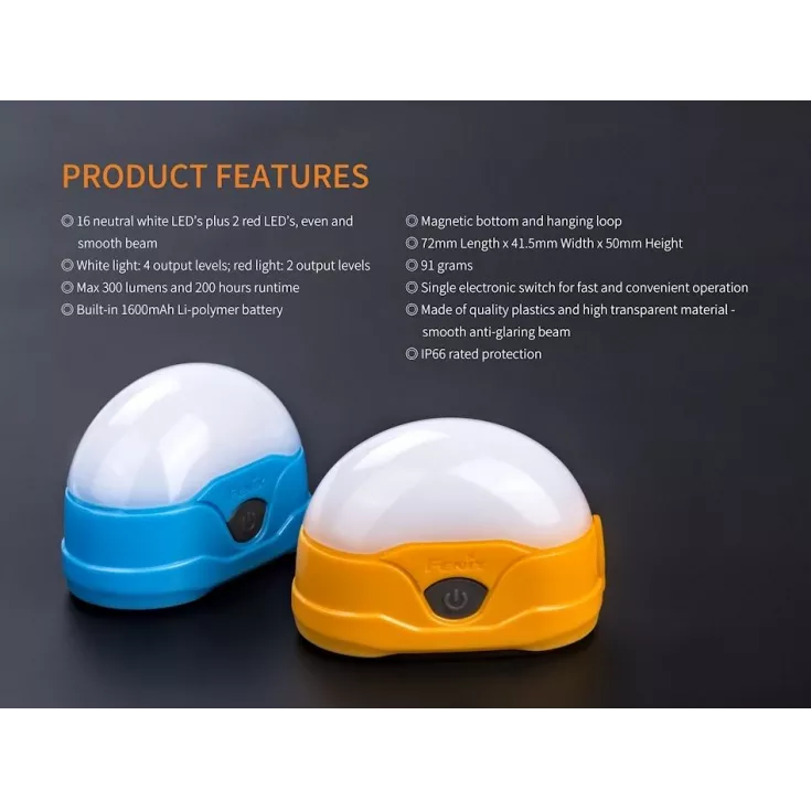 The Fenix CL20R is a rechargeable version of the popular CL20 camping light. The CL20R has a maximum output of 300 lumens from the 16 premium neutral white LEDs, in addition to red light from 2 red LEDs. The light is powered by a built-in, Li-polymer battery which is rechargeable via a micro USB port.