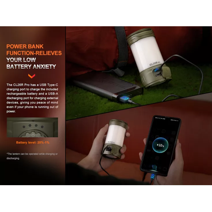 The CL26R PRO features a USB-A discharge socket enabling the lantern to be used as a convenient power bank. The battery is recharged via a built-in USB-C socket.