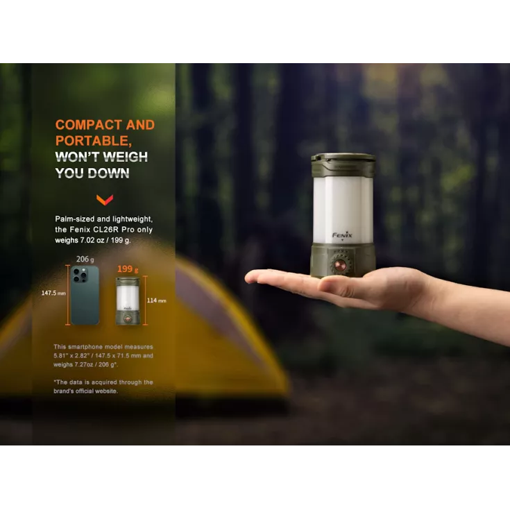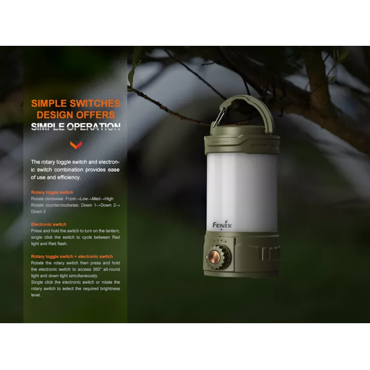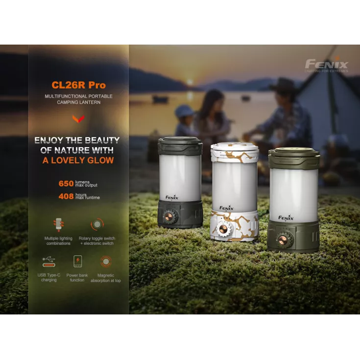The Fenix CL26R-PRO is a compact, rechargeable, multi-purpose camping lantern with a maximum output of 500 lumens and powered by 1 x 21700 battery (included). The lantern offers a range of lighting options, forward lighting (great for reading), 360° lighting, down lighting and combined lighting, making the light extremely versatile.