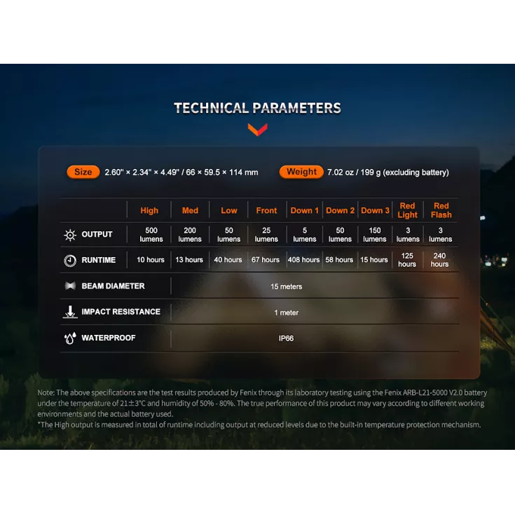 High: 500 lumens (10 hrs total runtime) – 15m beam radius