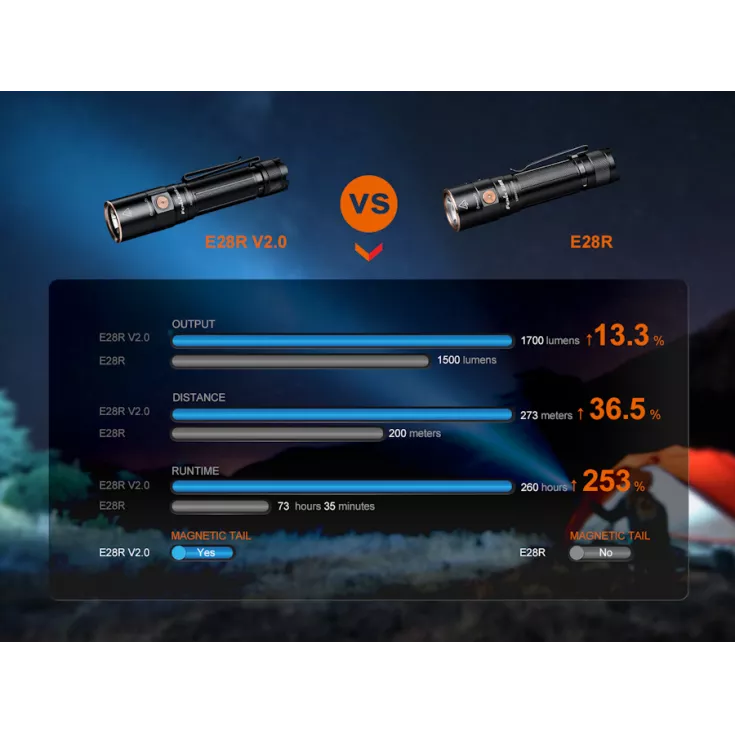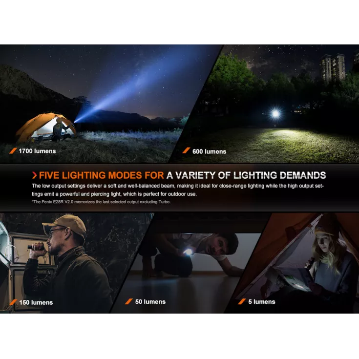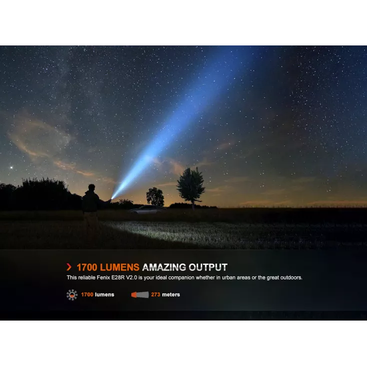 The Fenix E28R V2.0 is a compact, versatile, rechargeable, everyday carry torch with a maximum output of 1700 lumens and a 273 meter beam distance, powered by 1 x 18650 battery (included). The torch comes with a USB-C charging port for fast and convenient charging.