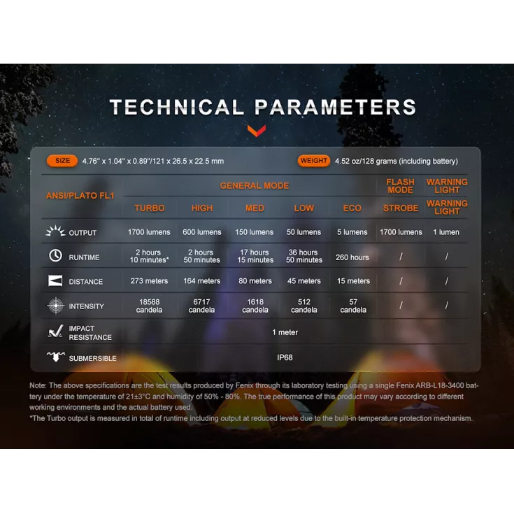 Turbo: 1700 lumens (2 hrs 10 min total), 273m beam