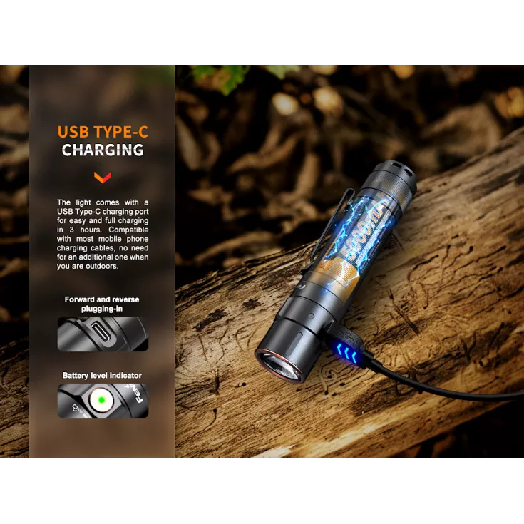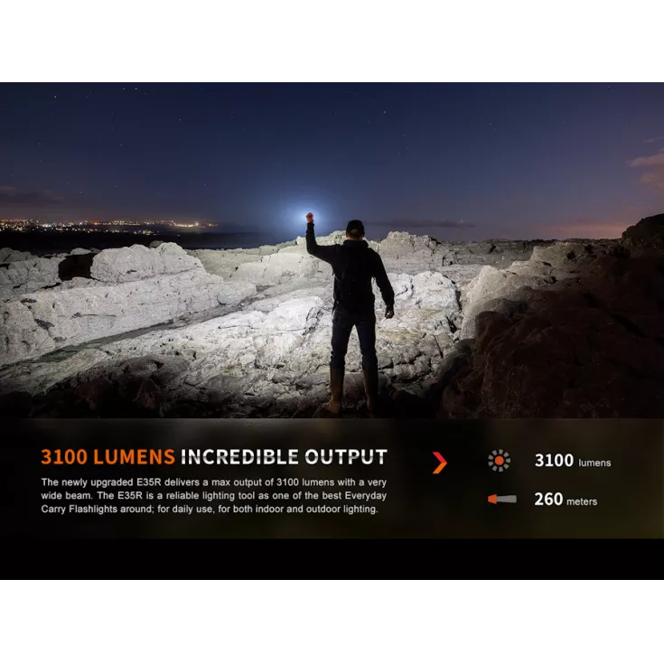 The Fenix E35R is a rechargeable everyday carry torch with an impressive 3100 lumens, powered by 1 x 21700 Li-ion battery.