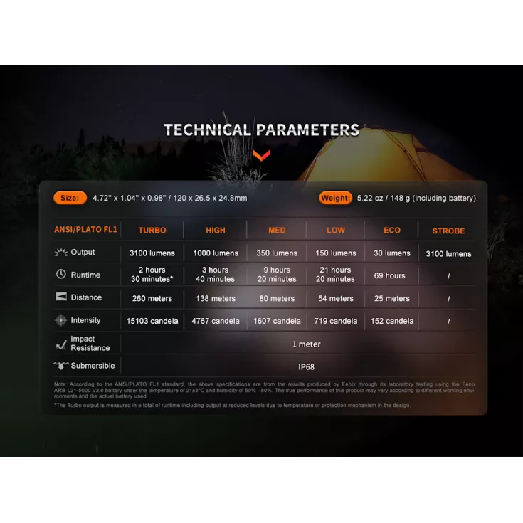 Turbo – 3100 lumens  (2 hrs 30 min) – 260m beam (burst mode – temperature regulated step down)