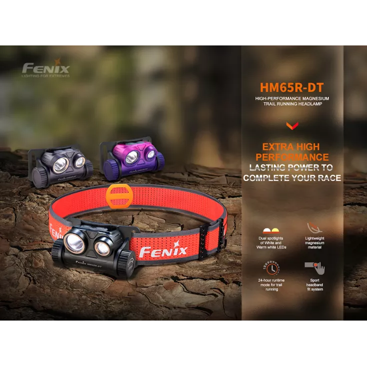 The Fenix HM65R-DT trail running rechargeable headlight has a maximum output of 1500 lumens from the Luminus SST40 white and SST20 warm white LED’s and is powered by a single 18650 battery (included).