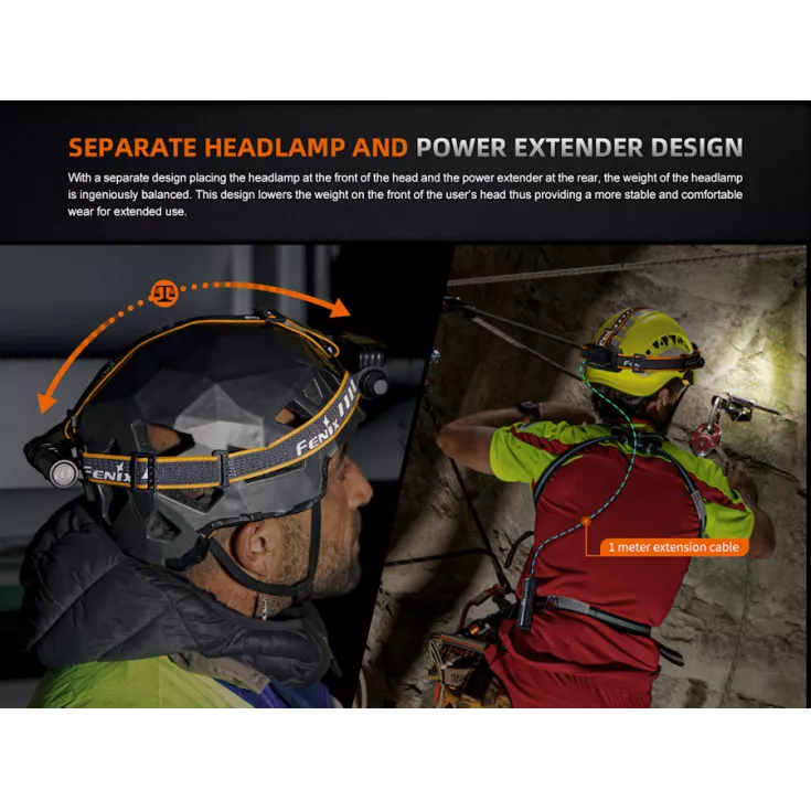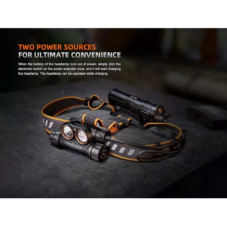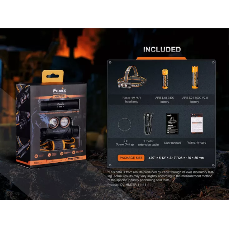 Fenix HM75R Included Accessories: ARB-L18-3400 18650 3400mAh battery, ARB-L21-5000 V2 21700 5000mAh battery, power extender, 2 x spare o-rings, 1 meter extension cable.