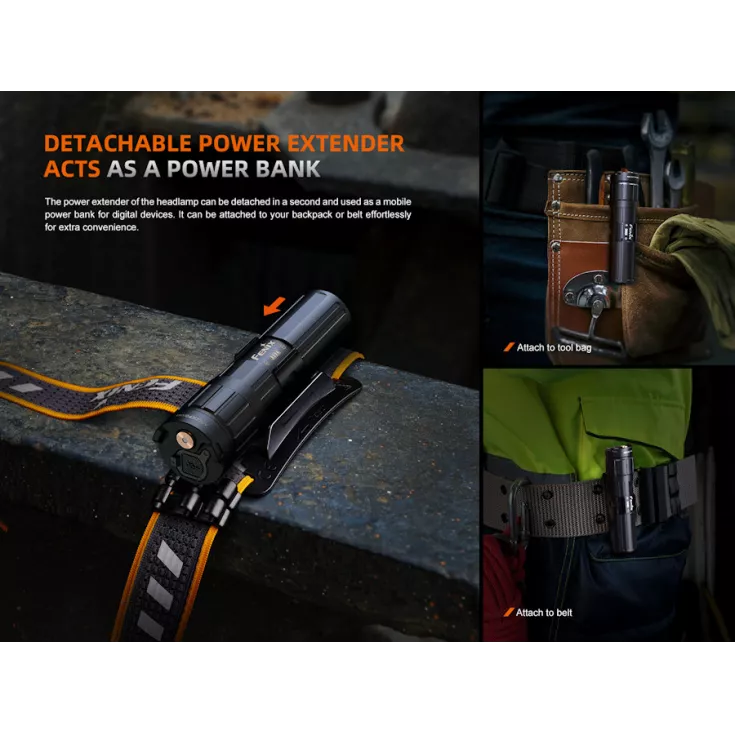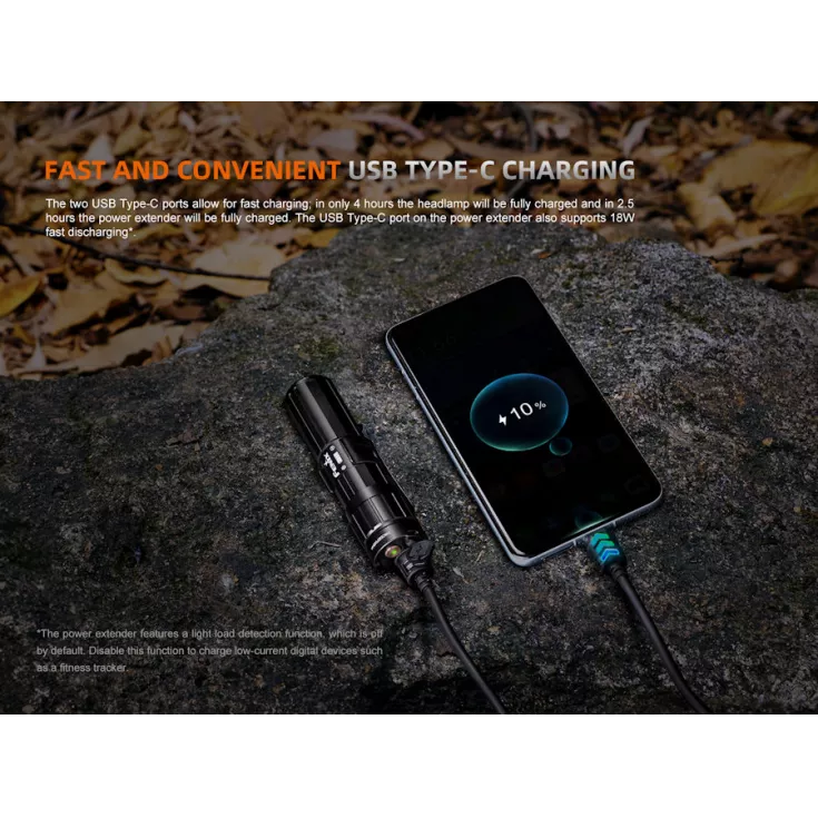 The power extender is detachable and can be used as a power bank to charge electronic devices and takes just 2.5 hours to fully charge via the USB Type-C port. When attached to the headlamp, it features a charging cable lock function to securely connect the headlamp and power extender, preventing any loose cables or connections.