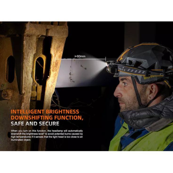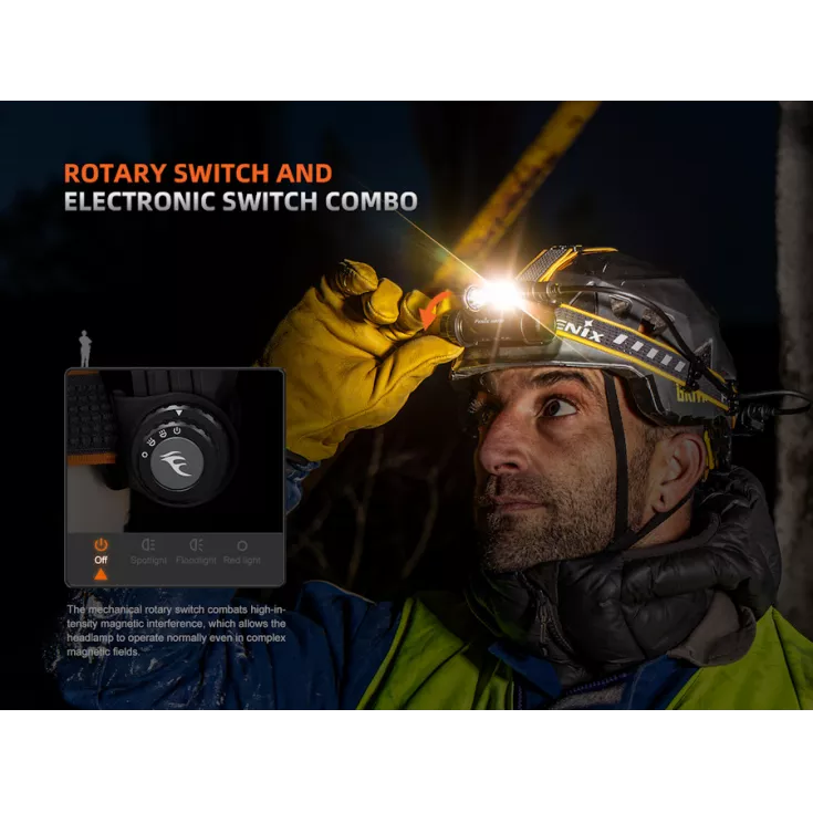 The HM75R is a triple coloured headlamp operated by a rotary switch to select the mode between spotlight, floodlight and red light, and an electronic switch to cycle through the brightness levels once in the desired mode. The light has an intelligent brightness downshifting function, enabling the brightness level to drop down when it is within 60 mm of an illuminated object, to avoid overheating.