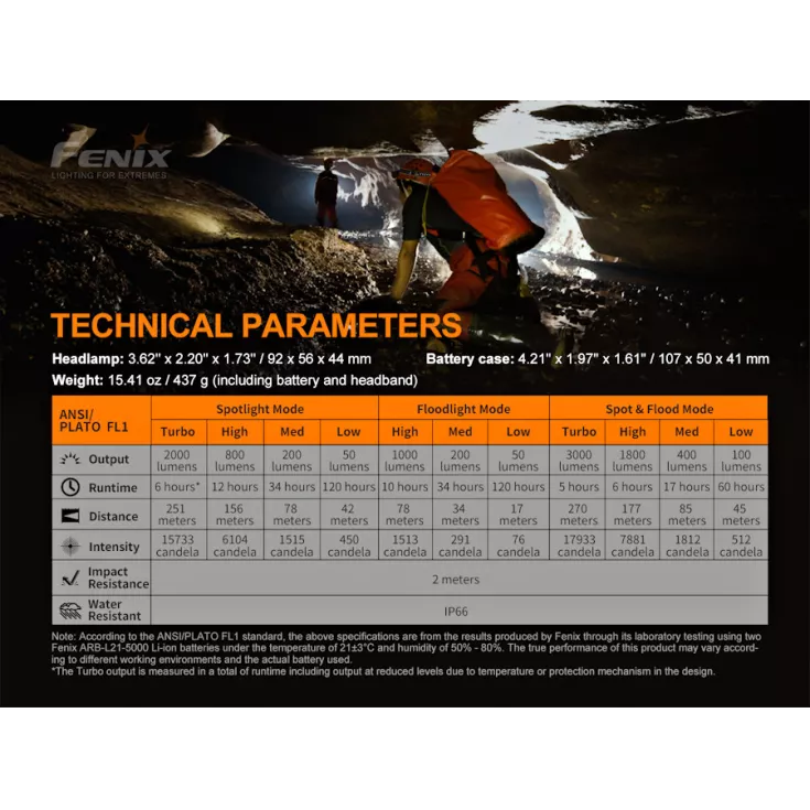 Turbo: 3000 lumens – 5 hours runtime (including output at reduced levels due to temperature or protection mechanism) – 270 meters