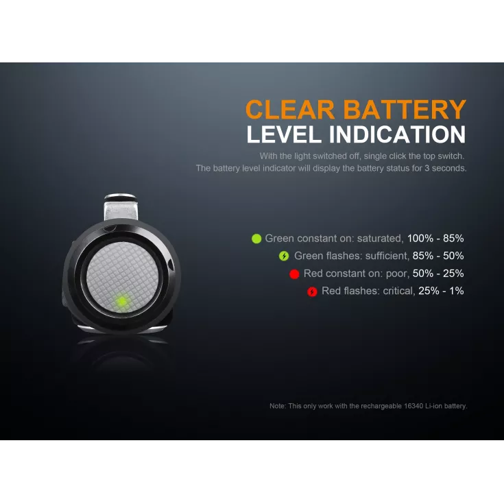 Includes: 1 x Fenix ARB-L16 700mAh RCR123A battery, USB charging cable, spare rubber boot switch, o-ring, holster.