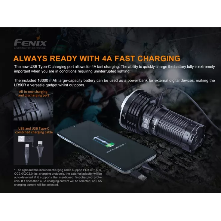 Fenix LR50R Includes: ARB-L52-16000 Li-ion battery pack, USB-C charging cable, holster, shoulder strap and spare o-ring.