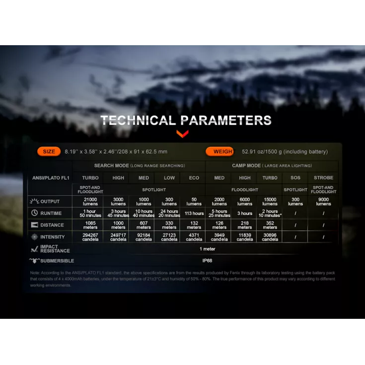 Turbo: 21000 lumens – 1 hr 50 mins runtime (spot and floodlight)