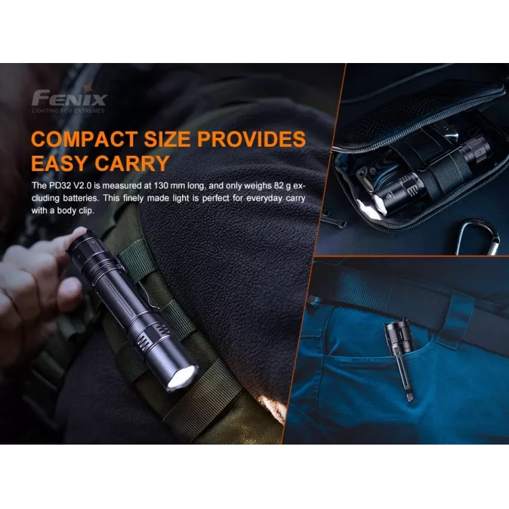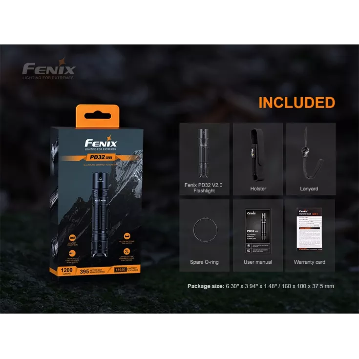 Fenix PD32 Version 2.0 includes: Belt holster, wrist lanyard, spare o-ring, pocket clip and 2 x CR123A single use batteries.