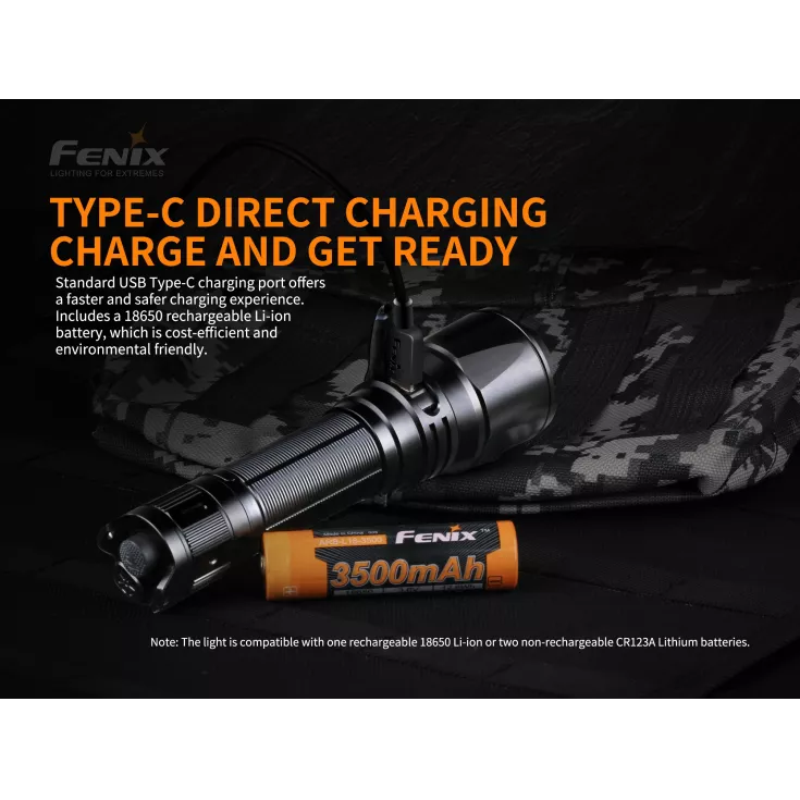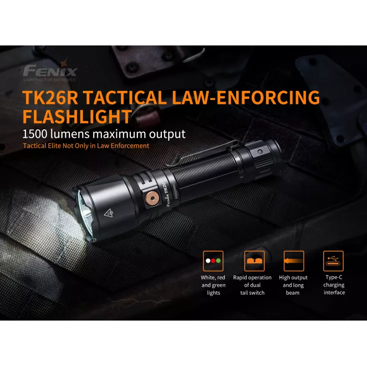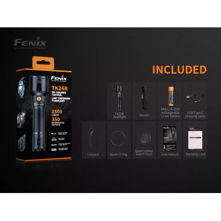 Fenix TK26R Includes: Belt holster, ARB-L18 3500 18650 battery, USB Type-C charging cable, wrist lanyard and spare o-ring.