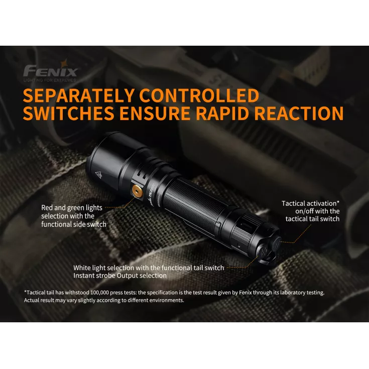 The Fenix TK26R features White, Red and Green LED outputs making it suitable for a variety of applications without the need for cumbersome filters. The main white LED is Luminus SST40, with Cree XP_E2 colour LEDs set either side in the reflector.