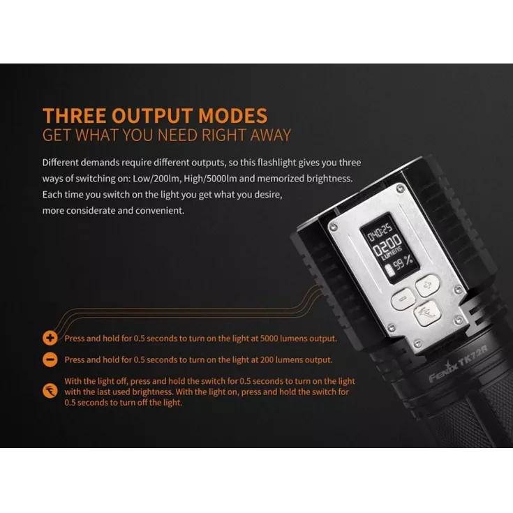 Operated via three stainless steel switches, which are positioned just below the display These give instant access to high power (5000 lumens), low power (200) lumens, instant strobe or the last used brightness level. Stepped light regulation means the TK72R can be adjusted from 100 lumens to 9000 lumens in 100 lumens increments by single clicking the +/- buttons or 1000 lumens increments by pressing and holding the +/1 buttons. Lockout function ensures the TK72R will not be turned on accidentally when not in use.