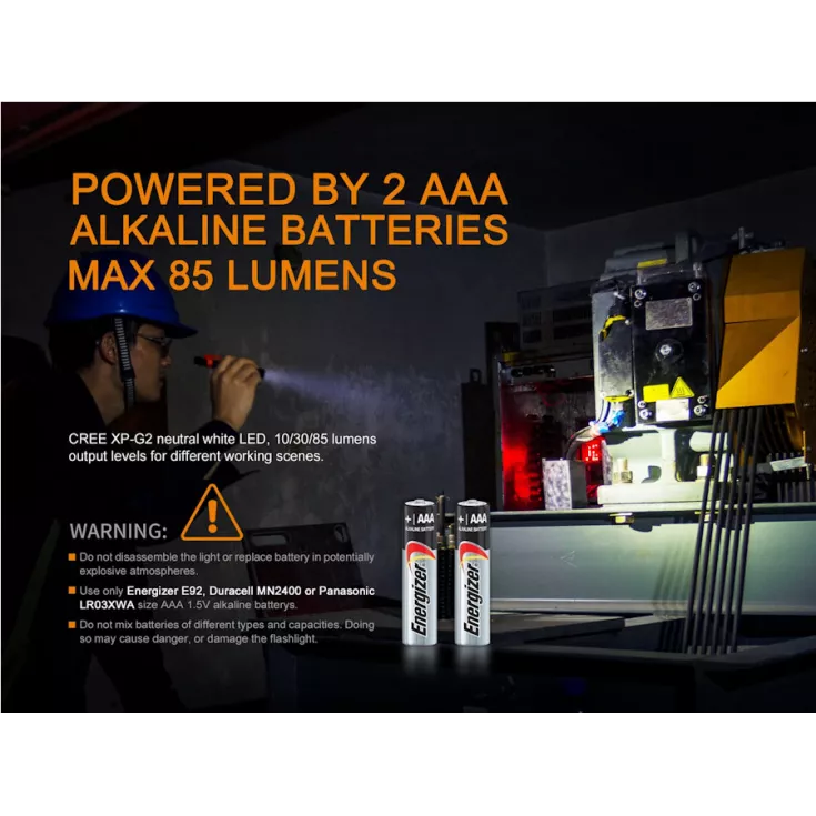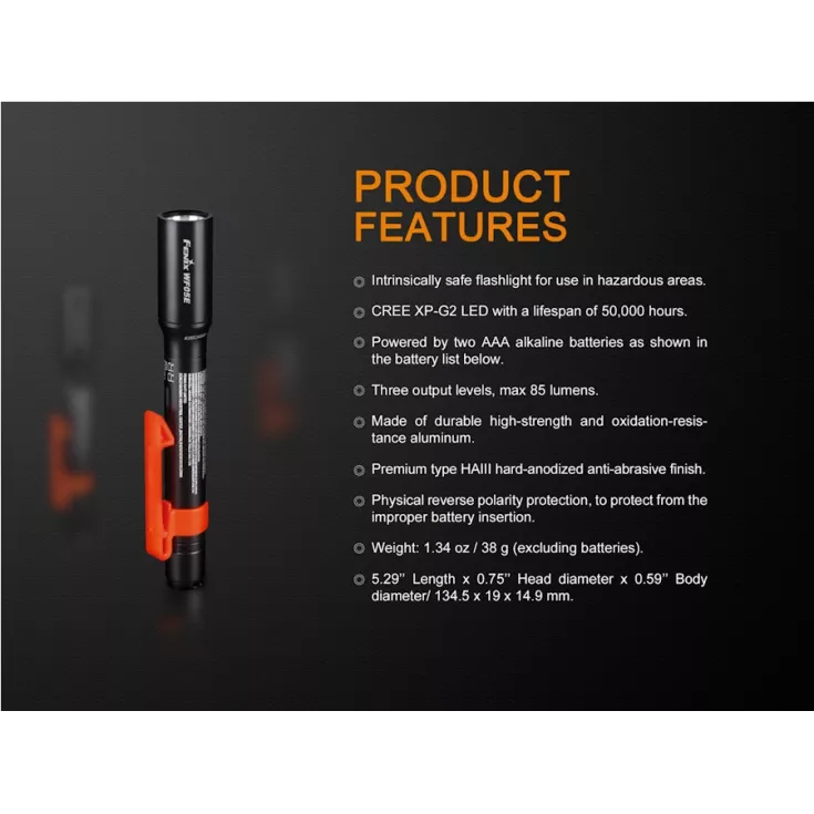 The Fenix intrinsically safe WF05E torch has a maximum output of 85 lumens from the Cree XP-G2 neutral white LED and is powered by 2 x AAA batteries. The torch has been designed for use in dangerous areas that have a risk of explosion, excluding underground mines. Please note, only the following approved alkaline AAA batteries to maintain the safety ratings: Energizer E92, Duracell MN2400, Panasonic LR03XWA.