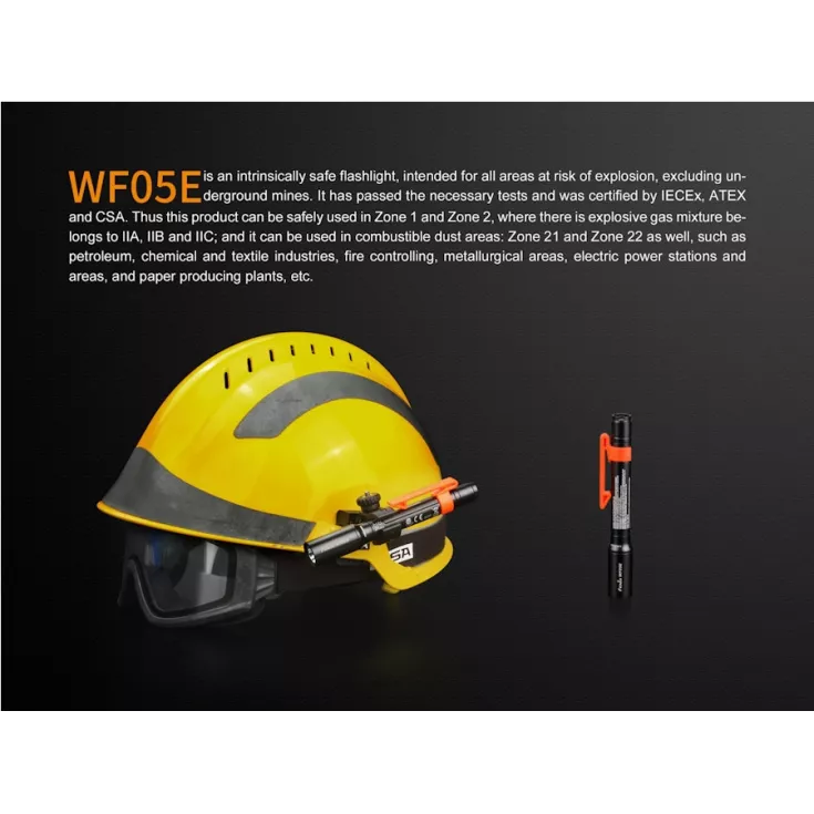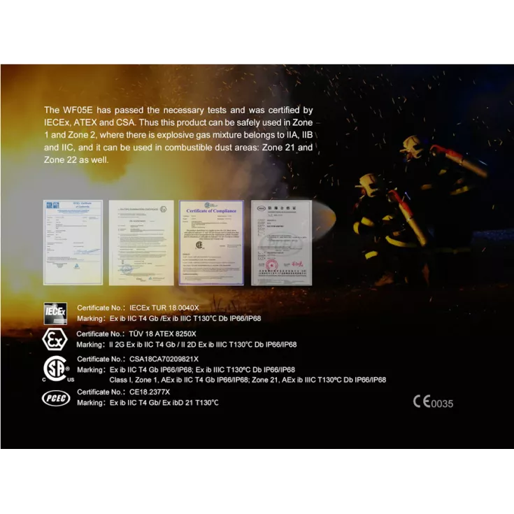 The WF05E is certified by IECEx, ATEX and CSA and can be safely used in Zone 1 and Zone 2 where there is explosive gas mixture in classes IIA, IIB and IIC. In addition, the torch can be used in combustible dust areas Zone 21 and Zone 22, such as areas containing or close to petroleum, chemical and textile industries, fire controlloing, metallurgical areas, electric power stations and paper producing plant industries.