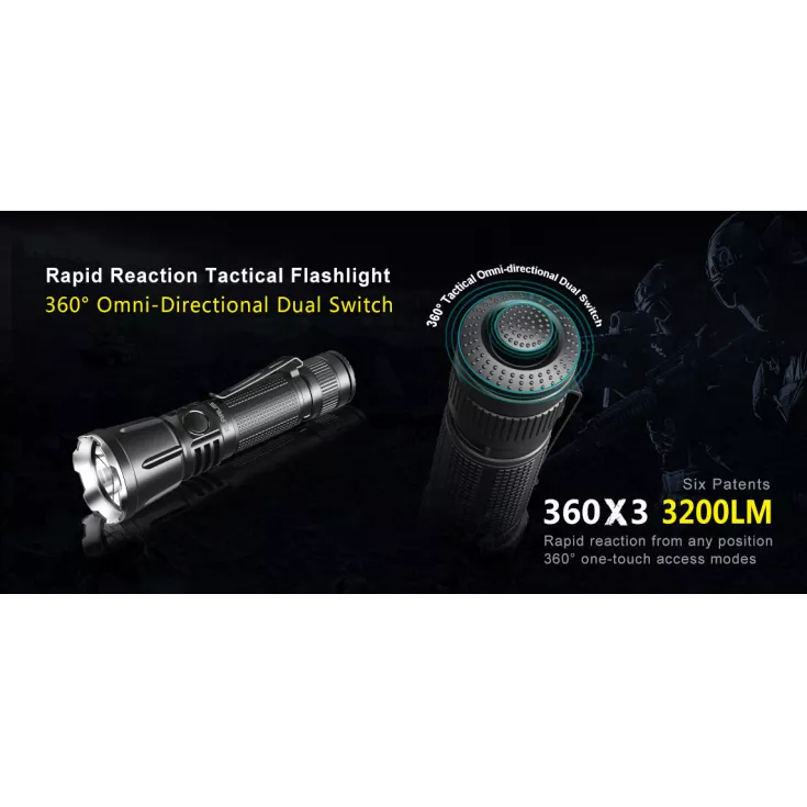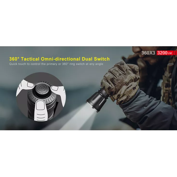 Featuring a 360º omni-directional dual switch, the torch can easily be operated, especially when using tactically, as the switch can comfortably be controlled using your thumb. The switch features anti-slip dots for good grip and is made up of a primary switch in the centre with a 360º ring switch around the central button. In addition, the 360X3 has a side switch for a less tactical approach to operation and providing an alternative hand position to suit general applications such as walking the dog.